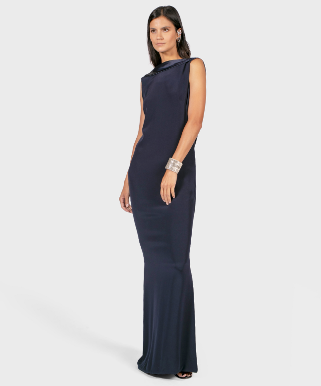 Location Robe de soirée Azzaro, modèle Ellie Navy. Cette robe est assez simple mais chic sur le devant de la robe. Mais dès lors que nous la retournons, elle laisse deviner un dos nu plongeant des plus iconique. Elle possède des bandelettes de tissu satiné qui entourent les encolures de la robe. Fluide, cette robe dévoilera votre silhouette élégamment.