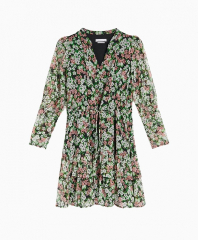Robe de soirée Essentiel Modèle Ladies Noire à Motifs. Cette robe longueur genoux est ornée de motifs fleuris verts, roses et blancs. Elle dispose d'un décolleté en V, de manches longues et de volants sur la jupe. Ce Printemps, on aime porter des robes à fleurs légères comme la robe ladies noire à motifs. Retrouvez un large choix de robes de printemps disponible à la location avec votre abonnement Une Robe Un Soir.