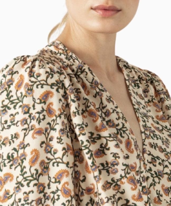 Robe de soirée Pablo, modèle Rubis Écru. Cette robe longue de la marque Pablo est confectionnée dans un tissu de couleur beige à imprimés fantaisies. Elle dispose d'une coupe de style bohème assez longue et vaporeuse. Le bas de la robe est fluide et le haut plus struturé, le décolleté est en V façon cache-coeur et les manches sont longues et de forme ballon. La taille est marquée par un élastique et la fermeture se fait à l'aide d'un zip invisible sur le côté gauche. Osez la mode durable avec l'abonnement Une Robe Un Soir ou la location à l'unité.