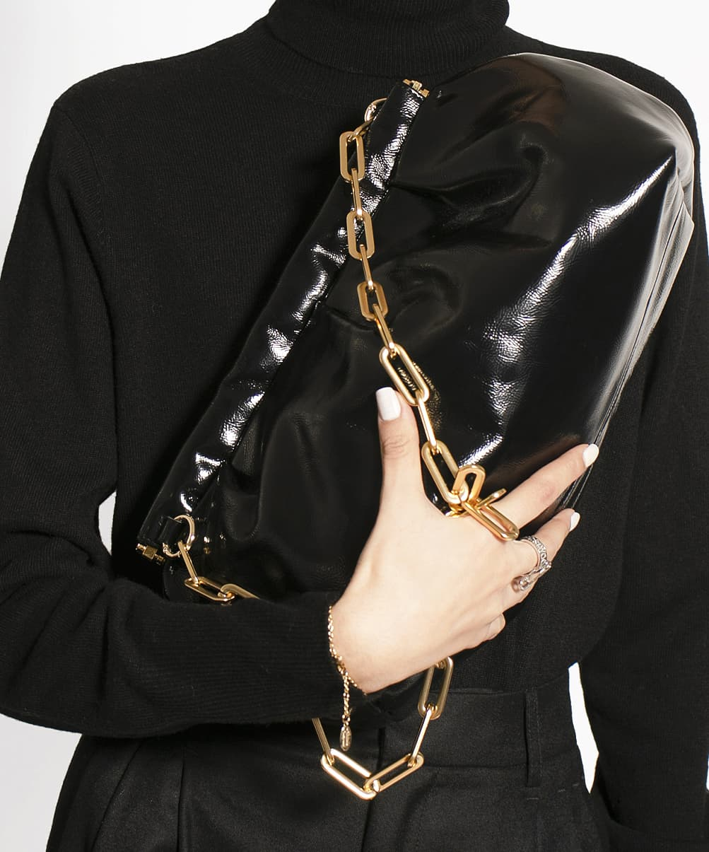 Sac Atelier Farny, modèle Coco Vernis Noir. Ce joli sac clutch noir en cuir est fait main et présente une fermeture à cliquet. Spacieux et élégant, il est doté d'une poche plaquée à l'intérieur. Grâce à sa chaîne amovible, il est possible de porter ce sac à la main, sous le bras ou à l'épaule. Ce sac Atelier Farny est disponible à la location à l'unité Une Robe Un Soir !